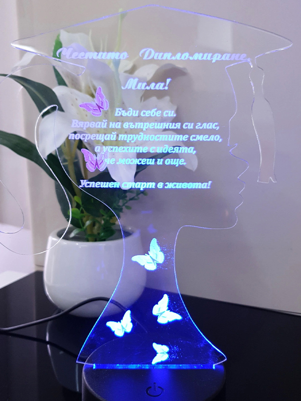 Подарък за завършване на абитуриент - "Абитуриент №1".Материал: Акрилно стъкло прозрачноРязане: Лазерно изрязванеПечат: Директен УВ печатРазмери: ..