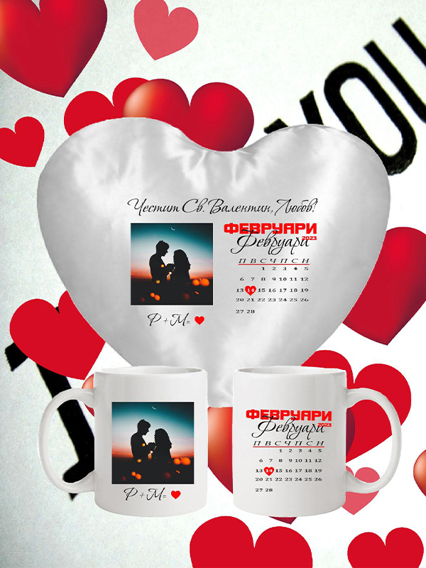 Декоративна възглавница с дата, месец, година, инициали, СНИМКА + чаша със същия дизайн