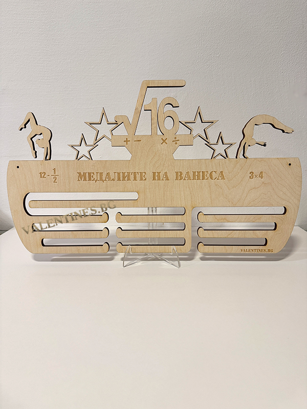 Поставка за медали Комбинирана - математика, ръгбиМатериал: шперплат - 8мм лазерно изрязан и гравиранПриблизителен размер: 50см/30смИзработк..