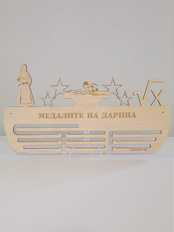 Поставка за медали Комбинирана - плуване, футболМатериал: шперплат - 8мм лазерно изрязан и гравиранПриблизителен размер: 50см/30смИзработка от 3 ..