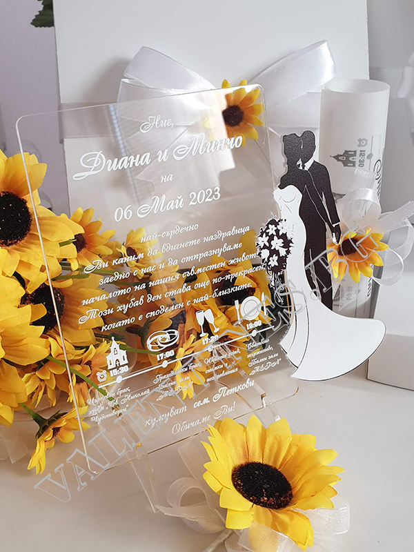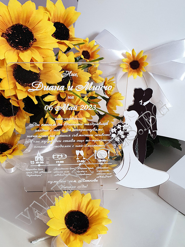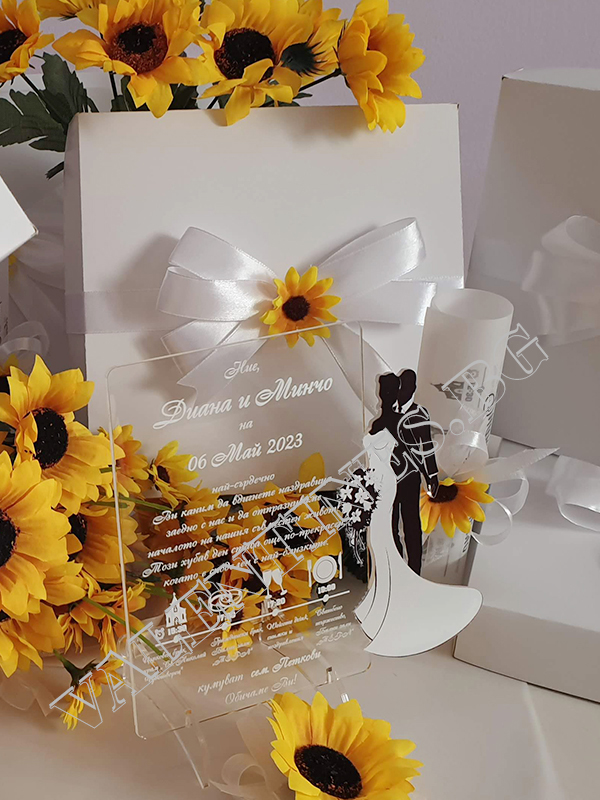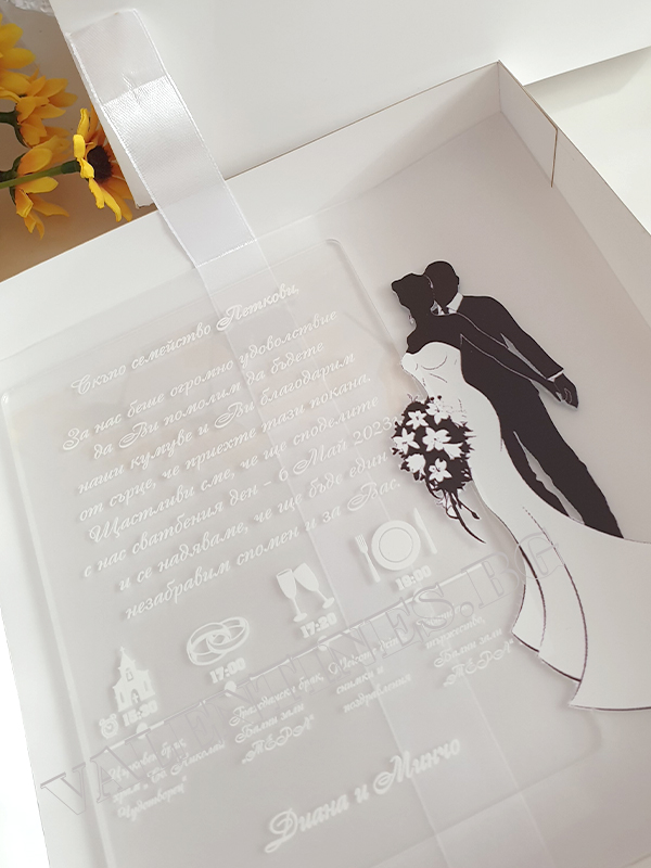 Луксозна сватбена покана за гости - младоженци от акрилно стъкло