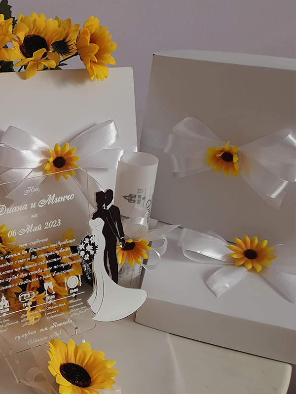 Вариантите на поръчка са два само покана или покана с кутия. Кутията може да бъде с цвете и панделка или с директен печат.