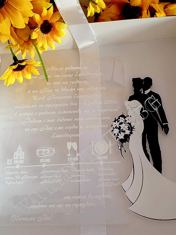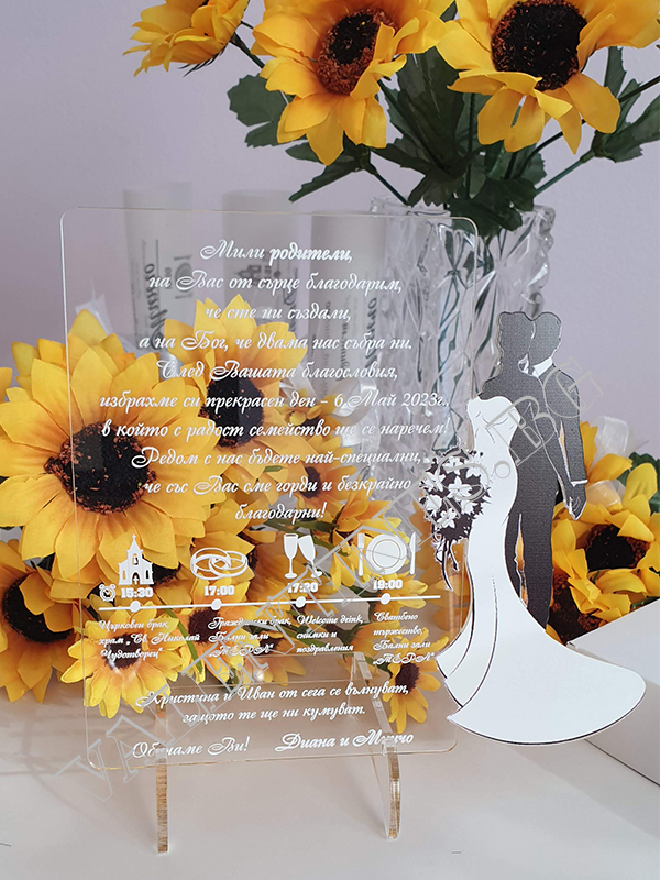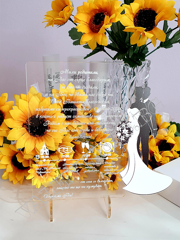 Луксозна сватбена покана за РОДИТЕЛИ - младоженци от акрилно стъкло