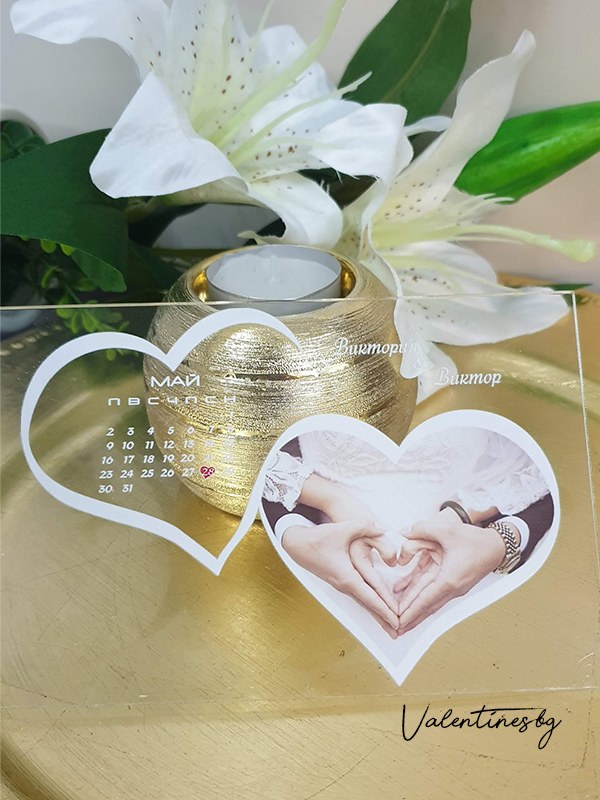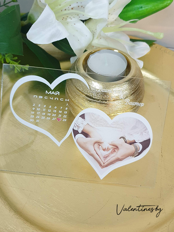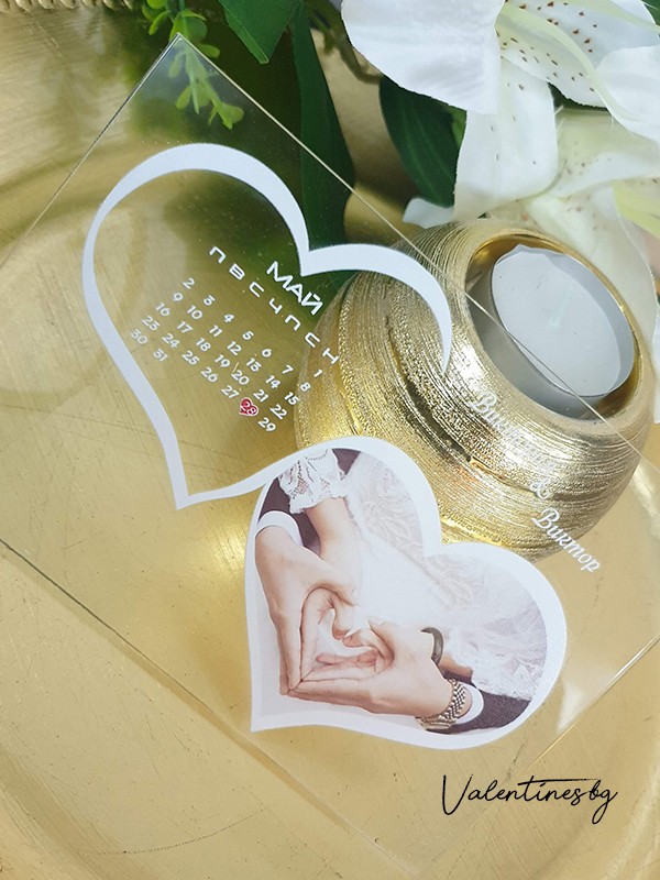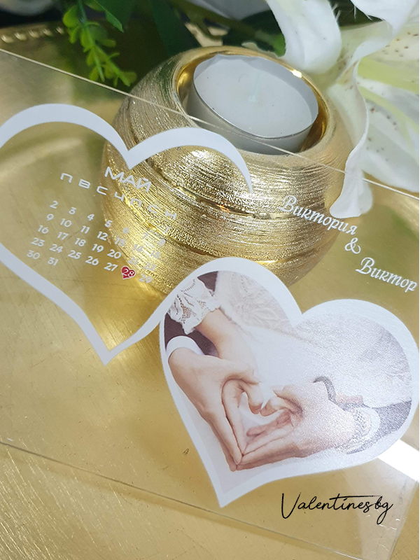 Акрилна сватбена покана СЪРЦА с дата и снимка на младоженците.