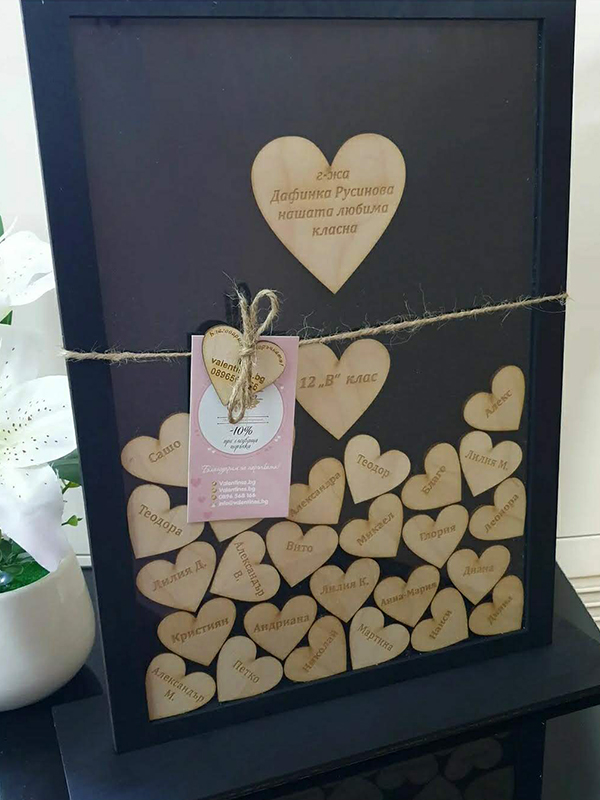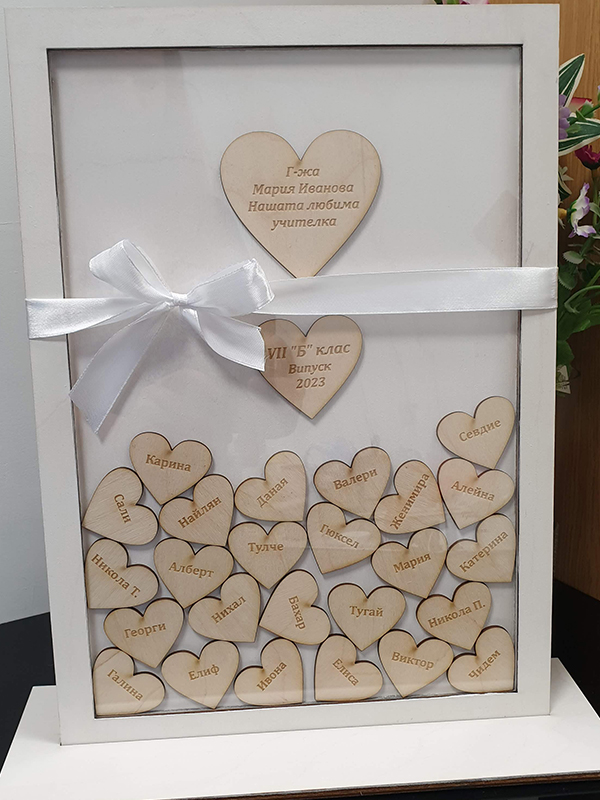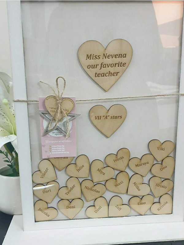 На всяко сърце лазерно е гравирано името на ученика. В средата са изписани имената на Вашия учител.