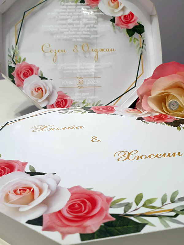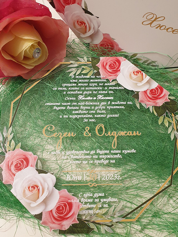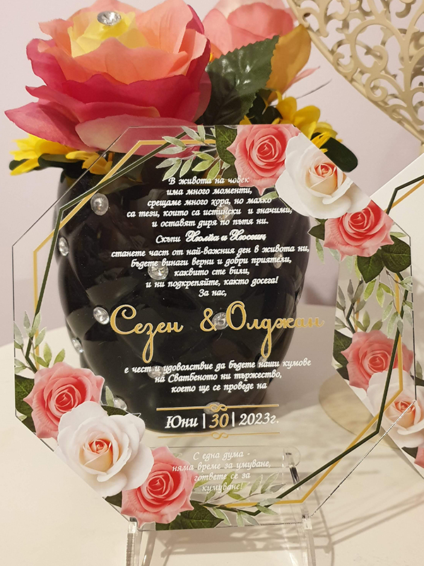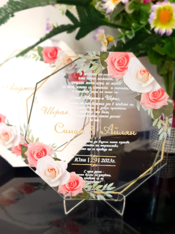 Луксозна сватбена покана за КУМОВЕ - рози осмоъгълна от акрилно стъкло