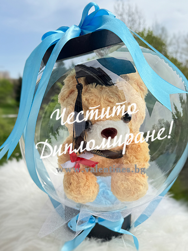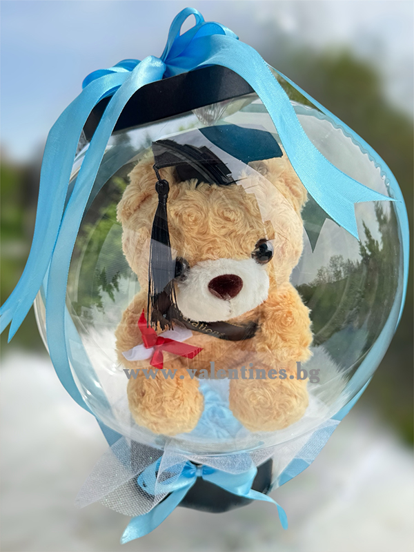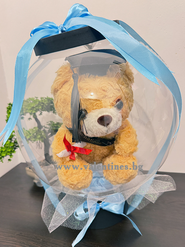 Кутия с кристален балон, въртящо се мече и рози за завършване - Синя панделка